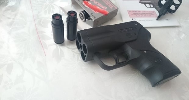 Заряд содержит раздражающий экстракт перца. Эффект длится от 10 до 15 минут. Пистолет можно использовать и против собак.