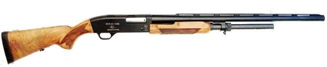 Ружье 12 калибра с помповым механизмом. Скользящее цевье скользит по магазину под стволом. Ствол холодной ковки с хромированным отверстием и удлинением цевья для замены выпускного фланца.