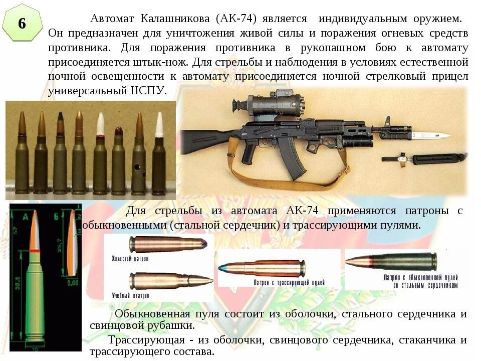 Существует несколько вариантов автомата Калашникова, но основной модификацией является АК-74. Существуют также: